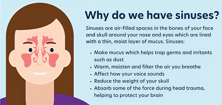 The sinuses are hollow spaces located behind the nose, around the eyes, and within the cheekbones.